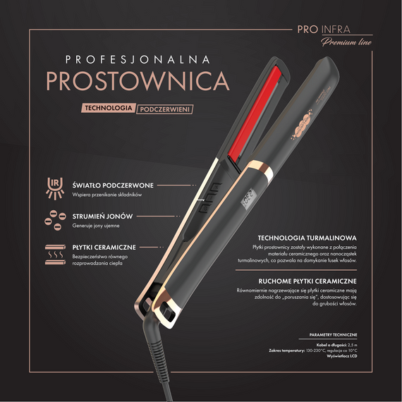 - Profesjonalna prostownica z podczerwienią i jonizacją, zapewniająca lśniące i wygładzone włosy.